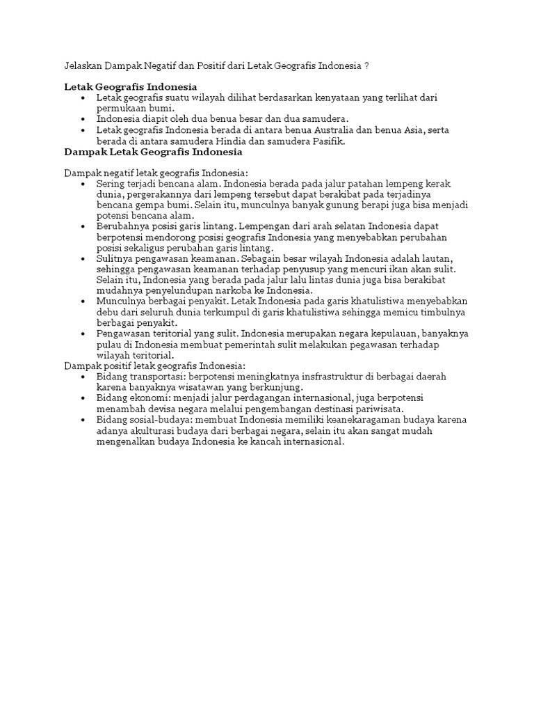 Identifikasilah pengaruh positif dan negatif dari letak geografis tersebut! Aug 16, 2017 · letak geografis indonesia berada di antara dua benua dan dua samudra yaitu benua asia dan benua australia, samudera hindia dan samudera pasifik. Identifikasilah pengaruh positif dan negatif dari letak geografis tersebut! Dengan demikian wilayah indonesia berada pada posisi silang yang mempunyai arti penting dalam kaitannya dengan iklim dan perekonomian.