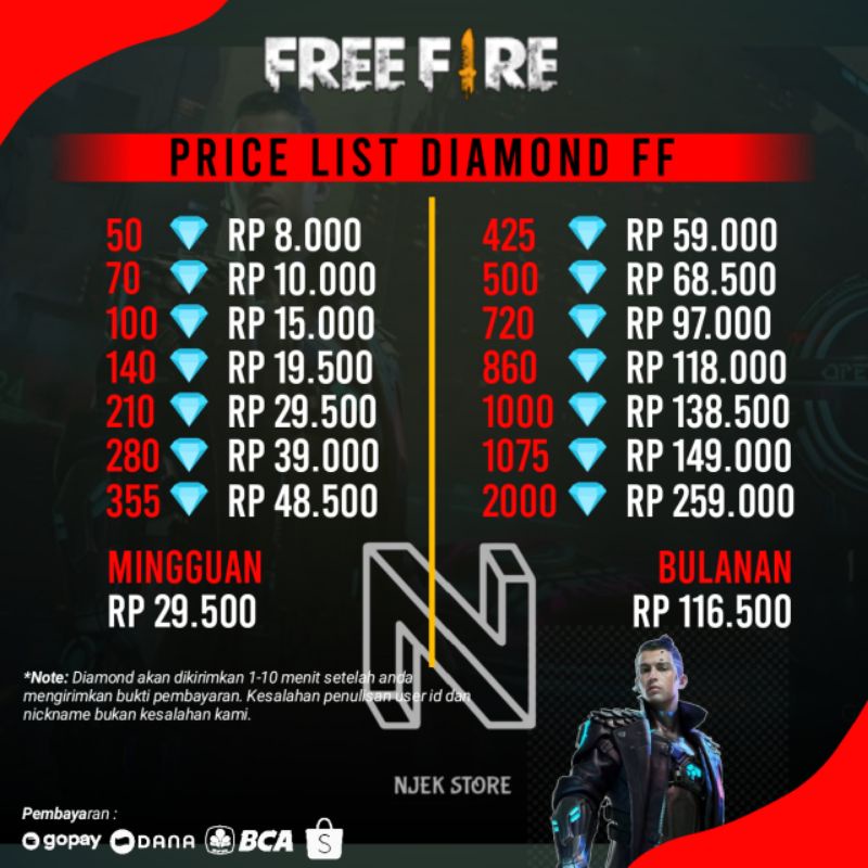 Untuk mendapatkan skin skin tersebut tentunya kalian harus mempersiapkan diamond yang banyak, diamond merupakan alat mata uang yang ada di dalam game free fire.